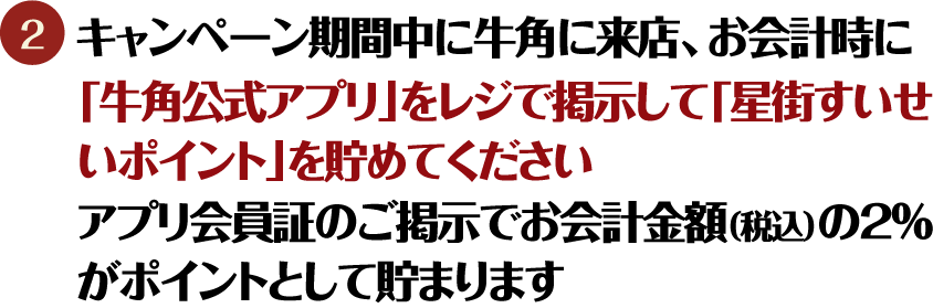 キャンペーン期間中「牛角公式アプリ」をレジで掲示してお会計金額(税込)の2%が「星街すいせいポイント」として貯まります